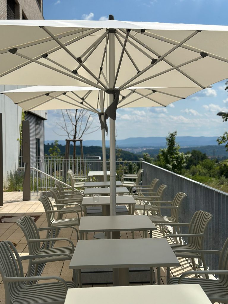 Unsere Terrasse lädt an warmen Tagen zum Verweilen ein. Zusätzlich steht unter der Woche das Foyer im Gebäude zur Verfügung: mit kostenlosem WLAN, Steckdosen, Lounge- und Arbeitsbereichen – ideal, wenn du in Ruhe arbeiten oder entspannen möchtest.